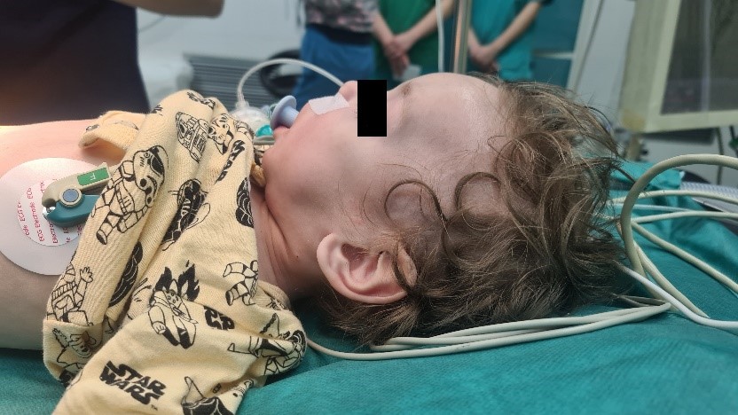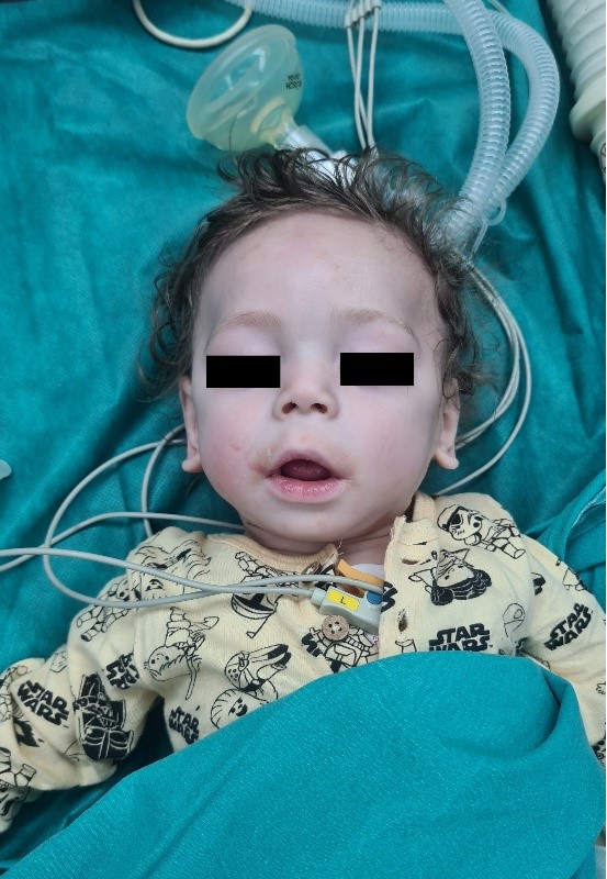 An 11 months old male child was admitted to the Clinic for Pediatric Surgery for elective operation for right-sided inguinal hernia. The patient was with growth delay (weighted 4.5kg), with hypotonia, without the ability to sit independently, nor to stand upright. Occasionally he was able to control his head movement, but he could not follow with his eyes. Echocardiography showed ASD secundum with L – D shunt without hemodynamic reflection. His antiepileptic therapy was canceled one moth earlier by his pediatric neurologist. In the physical examination, significantly long palpebral fissures and thinness in the 1/3 lateral of the highly curved eyebrows were observed. He had eversion in his lower eyelids. His nasal septum was low, and his ears were low set. The induction was started with 0.5mg/kg lidocaine, 1mcg/kg fentanyl and 4mg/kg propofol. Mask ventilation was easily performed and 0.6mg/kg rocuronium was given intravenously. The patient was intubated with a 3.0 cuffed tube using video laryngoscope. Caudal block was performed after the induction with 0.5ml/kg bupivacaine 0.25%. The anesthesia was maintained with 4-6 mg/kg/hour propofol. No complications were reported in the postoperative period.