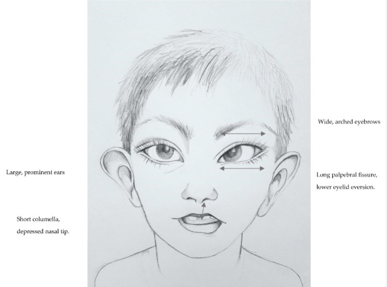 Figure 1. Characteristic phenotype appearance of patient with Kabuki Syndrome (This picture is taken from  Boniel S, Szymańska K, Śmigiel R and Szczałuba K. Kabuki Syndrome – Clinical Review with Molecular Aspects. Genes 2021, 12(4), 468; https://doi.org/10.3390/genes12040468)