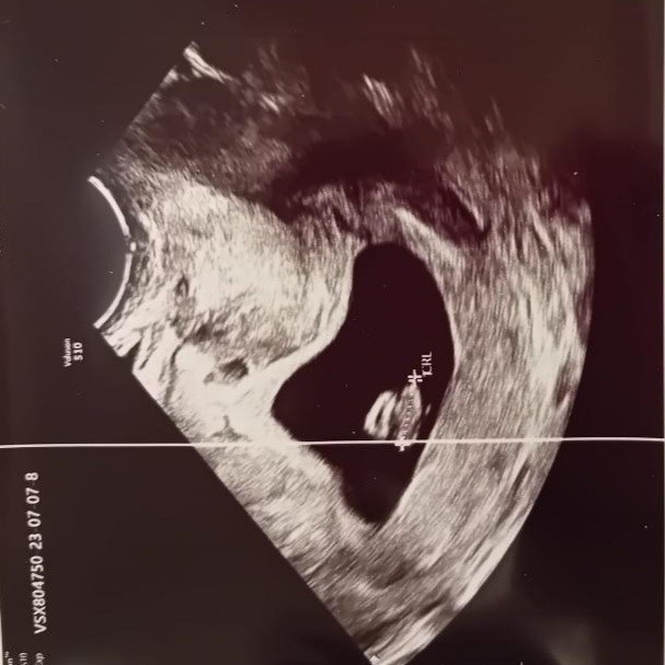 After two weeks of the embryo transfer, we received a positive pregnancy test and after 4 weeks of the embryo transfer, a vaginal ultrasound detected a fetus in the uterus, with a positive heartbeat (Figure 2).