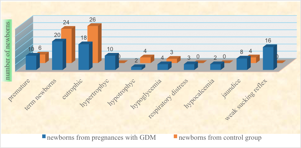 Results: The study included 60 parturients, 30 with GDM and 30 parturients without diabetes. In the group of mothers with GDM, the mean age was 33.6 (20%), they had a positive family history of diabetes and hypertension, 26 (87%) were obese, 12 (40%) had high blood pressure, 25 (83%) gave birth by caesarean section. 33% of their newborns were premature, 33% hypertrophic, 13% had hypoglycemia, 10% in need of oxygen support during the adaptation period, 7% with hypocalcemia, 27% with prolonged hyperbilirubinemia. A weaker sucking reflex and weaker muscle tone were noted in half of the newborns of mothers with GDM.