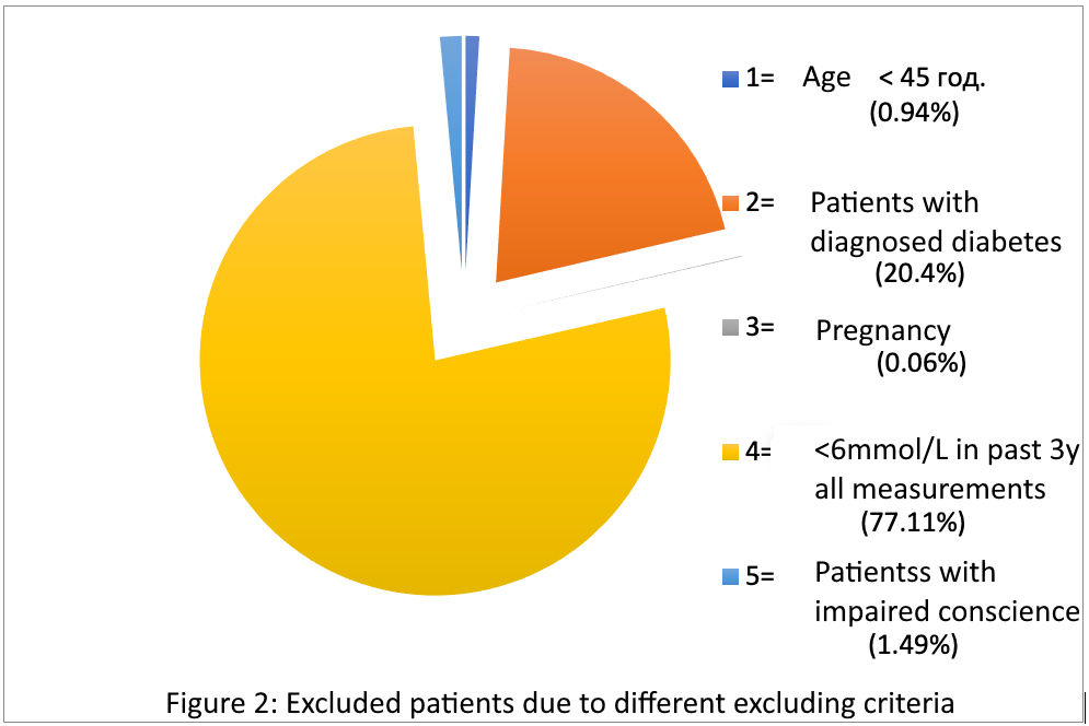 Due to previously diagnosed T2D, 12.6% of patients aged 45-70 years were excluded from the study, which indicates a higher prevalence of diabetes in this age group compared to the national one (IDF, 2019). Furthermore, almost half of the total number of patients aged 45-70 years, 47.69% (in the literature 20.5%), are excluded due to the fact that all glycemia measurements in the past years are below 6mmol/l (normoglycemia). This is due to the preventive goals that doctors work in agreement with FZOM for early detection of type 2 diabetes by means of population screening, which is an example of the positive effects of early diagnosis in general (Koller et al., 2024; Aizpuru et al., 2012).