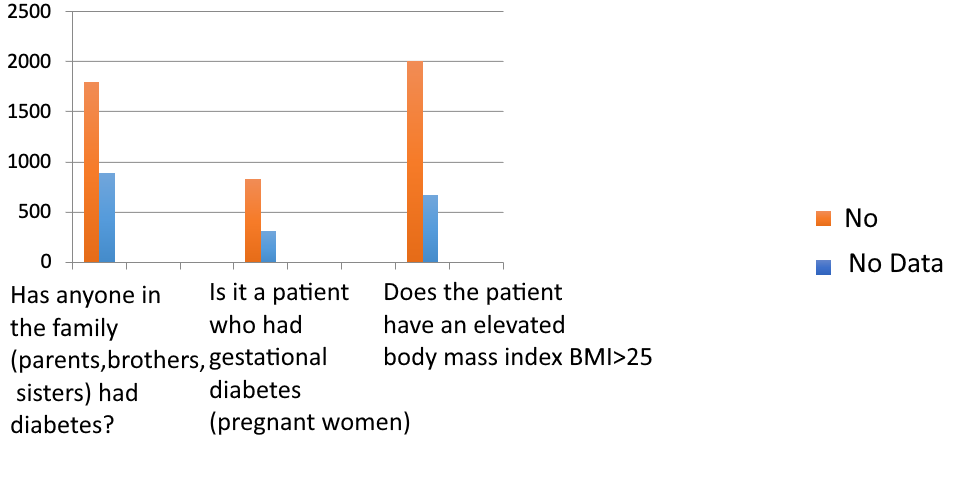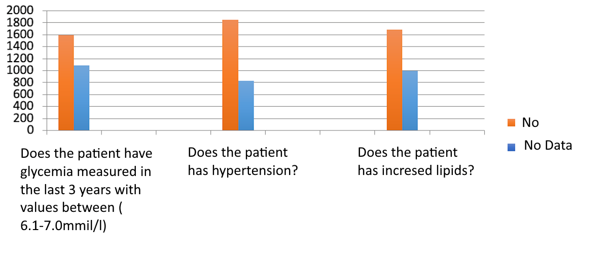Chart 3 displays the distribution of responses regarding the presence of risk factors among the group that will not undergo screening, highlighting the ratios of ‘NO’ and ‘NO DATA’ responses. Among the six risk factors assessed, 1,329 (49.35%) patients did not respond to one or more questions out of the total 2,693 patients. Consequently, these patients are excluded from the screening group due to either the absence of risk factors or incomplete data on one or more risk factors.