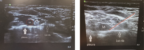 Figure 4. Ultrasound findings of supraclavicular brachial plexus block: pleura, first rib, SA- subclavian artery, and PB – brachial plexus posterolateral to the artery. The first image shows a US scan on a 2-year-old patient and the second an 11year old patient. The red line is directed on the “corner pocket”