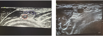 Figure 7. Ultrasound findings of axillary block: A- axillary artery, V – veins, MN – medial nerve, UN – ulnar