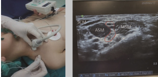 interscalene brachial plexus block: case of a 3-year-old child: SCM – sternocleidomastoids muscle, ASM – anterior scalene muscle, MSM – middle scalene muscle, brachial plexus is outlined with a red line